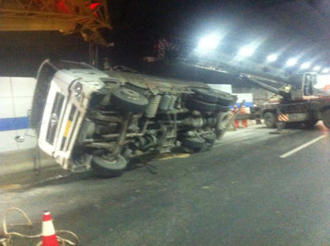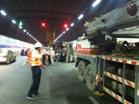 2015年10月4日凌晨4:20分隧道上行线32K左右处,一辆水泥槽罐车由于司机操作不当,撞上隧道墙壁后车翻。