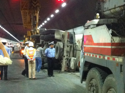 2015年10月4日凌晨4:20分隧道上行线32K左右处,一辆水泥槽罐车由于司机操作不当,撞上隧道墙壁后车翻。