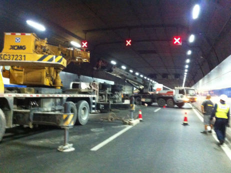 救援人员了解现场基本情况,考虑到隧道高度5.5米,也就是作业时无法展臂及无法抬臂,增加极大施救难度,提出调动了100吨加三十吨的配重,和一台五十吨的汽车吊赶往现场,并在各界领导的确定下,隧道能承受大型设备的施救。